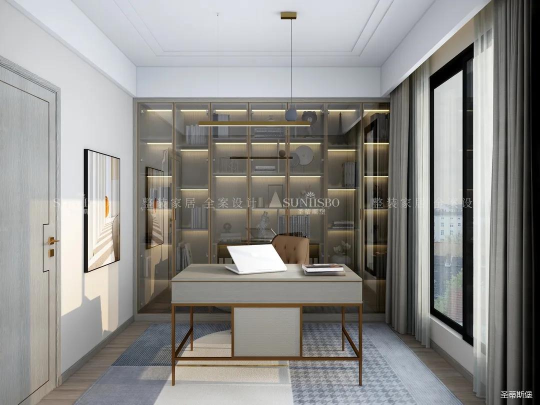 书房在阳光下衬得通透自然,半透明的灰玻利用高级且亲和的色彩贯穿着柜体与空间的互动,温润的木质、轻奢的金属以拼合的状态,将屋主感性与时尚的生活理念渗透进书房空间。不同材质的搭配为空间增添平衡感,使得紧绷的工作状态得到放松。